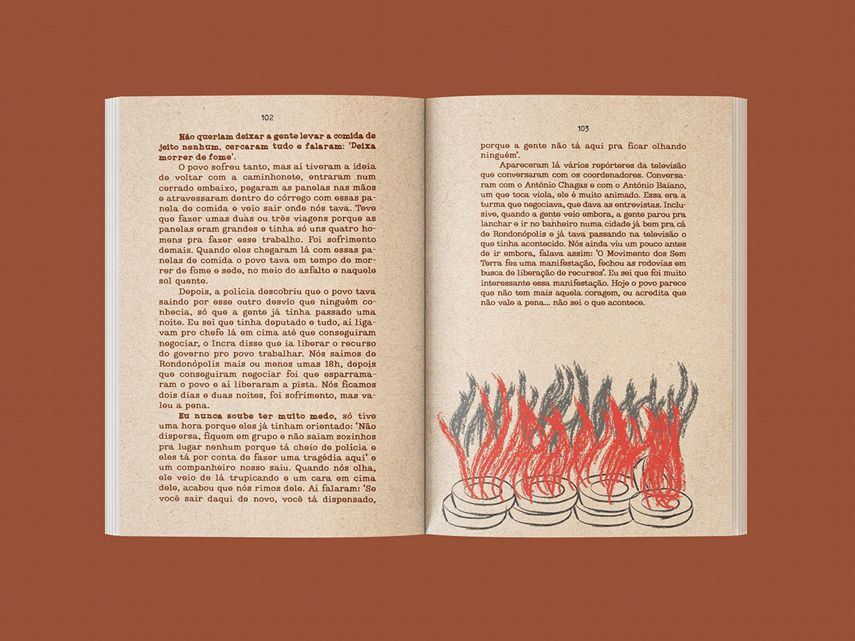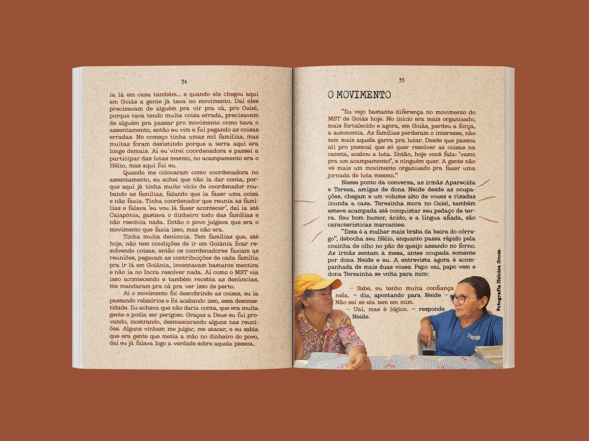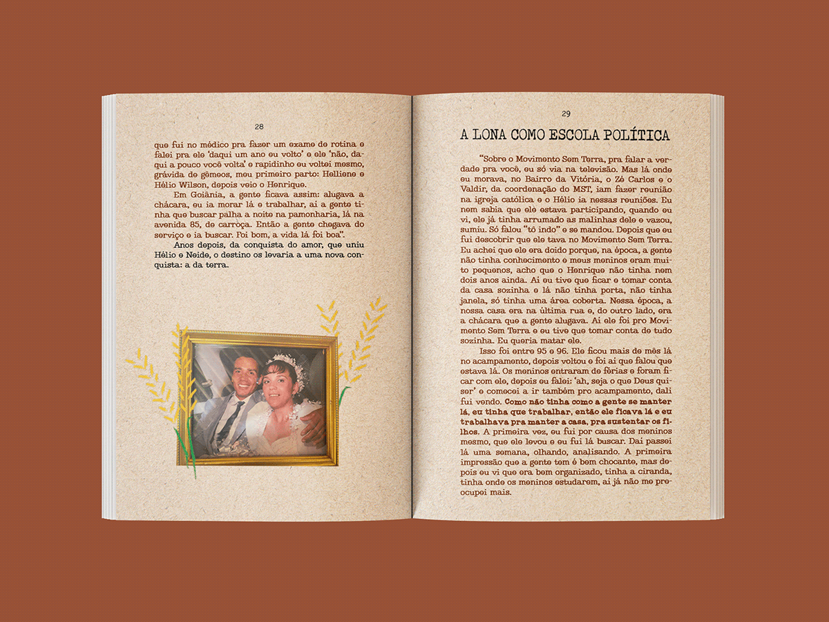 A construção estética buscou traduzir visualmente a materialidade do campo, a força simbólica da terra e a dimensão política das trajetórias apresentadas, articulando imagem, tipografia e ritmo de leitura de forma coerente com o caráter documental e militante do projeto. O planejamento gráfico e editorial contribuiu para a organização do conteúdo, definição de linguagem visual e consolidação do livro-reportagem como objeto comunicacional, reforçando seu compromisso com os direitos humanos, com o jornalismo popular e com as lutas narradas.