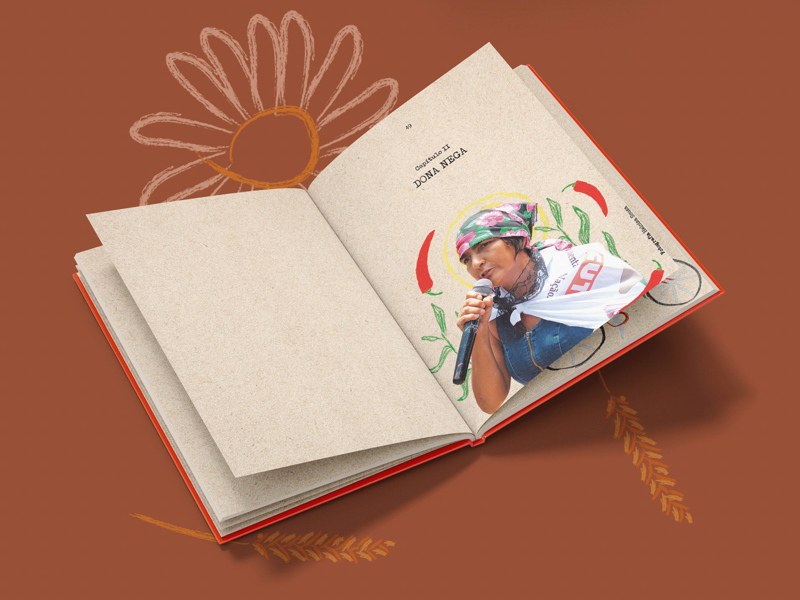 A participação no projeto experimental No Chão Vermelho – narrativas de mulheres camponesas na luta pela terra envolveu o planejamento gráfico e editorial da obra, além da criação das colagens, ilustrações e da diagramação do livro. O trabalho visual foi pensado como parte indissociável da narrativa jornalística, dialogando com as histórias de vida, memória, resistência e pertencimento das mulheres retratadas.